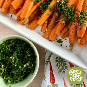 Gremolata is an Italian “dry sauce” used to add earthy freshness to dishes like Osso Bucco and pasta. Here we have used the green tops from carrots for a no-waste option. Delicious on fish, or as an accompaniment to roasted vegetables, this will be your new favorite way to use carrot tops. Ingredients with an asterisk (*) are available seasonally right here in North Iowa! Click on select ingredients to find them nearby or stop by your local farmer’s market.