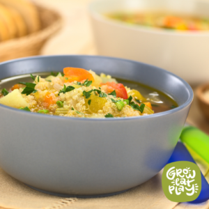 This comforting, Creamy Quinoa Soup is made even better with fresh, local ingredients like ground pork, seasonal vegetables, and vibrant spinach. Simmered in rich bone broth and Italian herbs, it’s a perfect balance of hearty and healthy. Chickpeas and quinoa add a protein-packed boost, while whole milk gives the soup a creamy finish. Top with a sprinkle of Parmesan for a satisfying, locally inspired meal that highlights the best of our region's flavors. Perfect for cozy nights and packed with nutrient-rich ingredients!Ingredients with an asterisk (*) are available seasonally right here in North Iowa! Click on select ingredients to find them nearby or stop by your local farmer’s market.