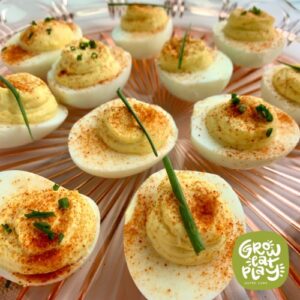 • Use a table spoon to add the yolk mixture back atop the eggs. Sprinkle with paprika and microgreens or dill.