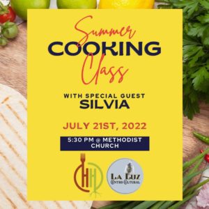 We are excited to partner with La Luz Cultural Center in Hampton to offer a Cooking Class on July 21 from 5:30 -7 pm at the Hampton Methodist Church. Their special guest chef – Silvia – will teach you how to cook chicken tacos with a delicious salsa and guacamole to accompany the tacos.