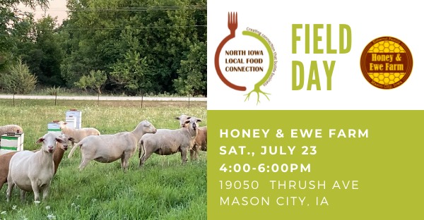 Healthy Harvest of North Iowa is hosting a Field Day to learn about and celebrate local and sustainable farming practices. The event will be held at Honey & Ewe Farm, who produces honey, bees, and bee products, as well as a variety of livestock – cattle, chickens, sheep, and a diverse selection of vegetables.