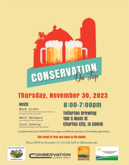Iowa Learning Farms, in partnership with the Floyd County Soil and Water Conservation District and Conservation Learning Group, will host “Conservation On Tap,” Thursday, November 30 from 6-7 p.m. at Tellurian Brewing in Charles City.