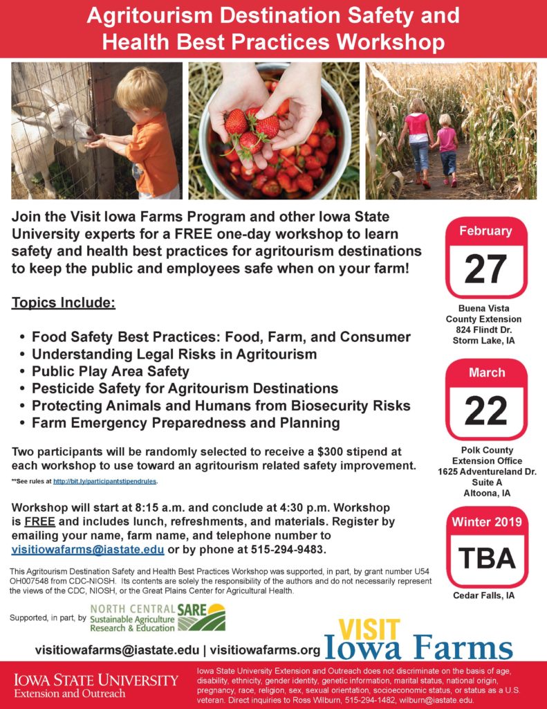 ISU Extension and Outreach Visit Iowa Farms program will be offering Agritourism Destination Safety and Health Best Practices Workshops in Storm Lake (Feb. 27th), Altoona(March 22nd), and Cedar Falls(Winter 2019). These 1-day workshops are free to attend including meals, refreshments, and materials. ISU Extension and Outreach experts will discuss food safety best practice topics such as food, farm and consumer, understanding legal risks in agritourism, public play area safety, pesticide safety for agritourism destinations, protecting animals and humans from biosecurity risks, and farm emergency preparedness and planning. Also at each workshop, two participants will be selected at random to receive a $300 stipend to use toward an agritourism-related safety improvement.