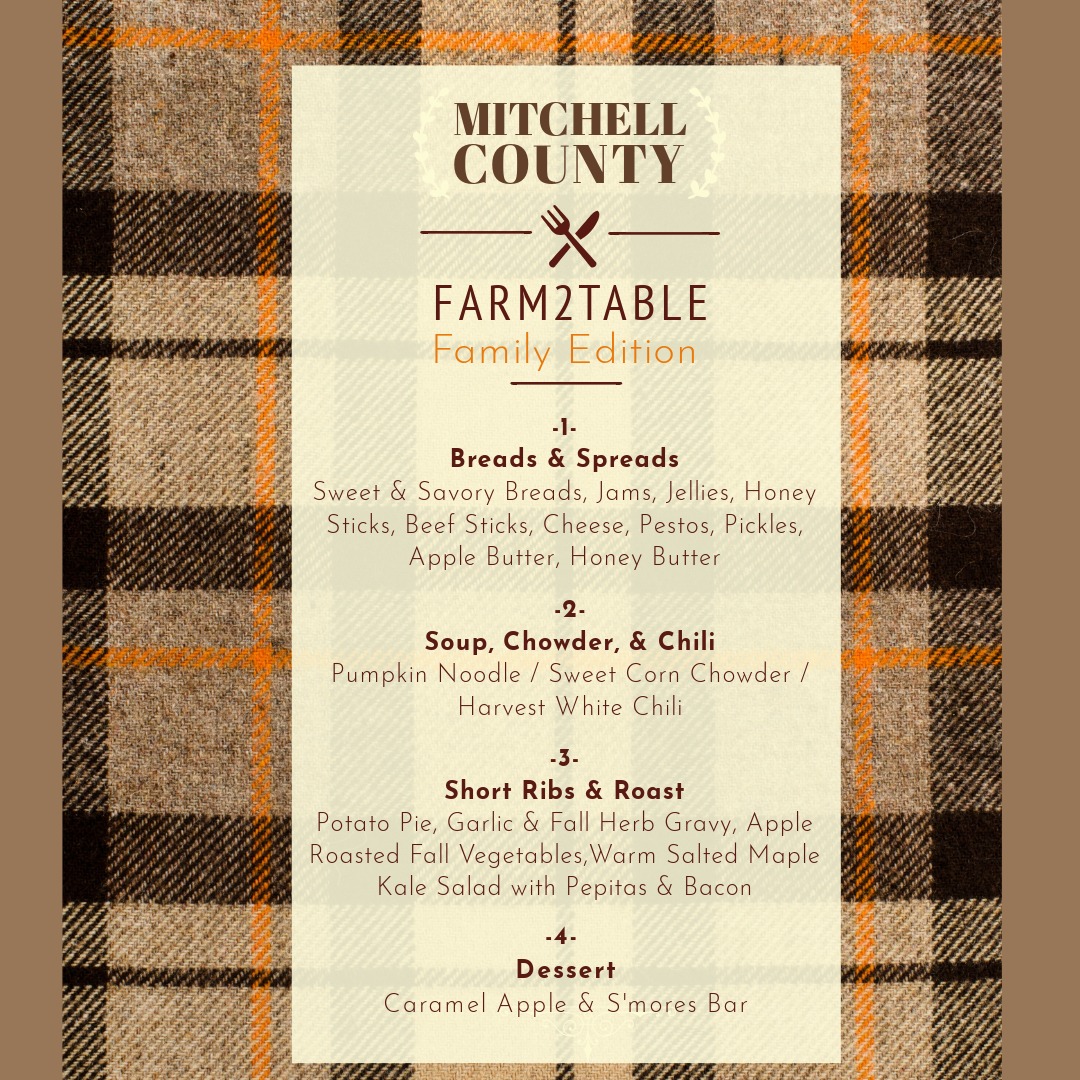 Join us for an unforgettable evening celebrating local food and community at the 9th Annual Mitchell County Farm2Fork Dinner, hosted by Grow. Eat. Play. member Chef Jess Baldus of Taste. Enjoy a farm-to-table dining experience in a family-friendly, relaxed atmosphere. The event features live music by Bruce Forshay, community-style seating, and a delicious menu showcasing local farmers and producers from Mitchell County.