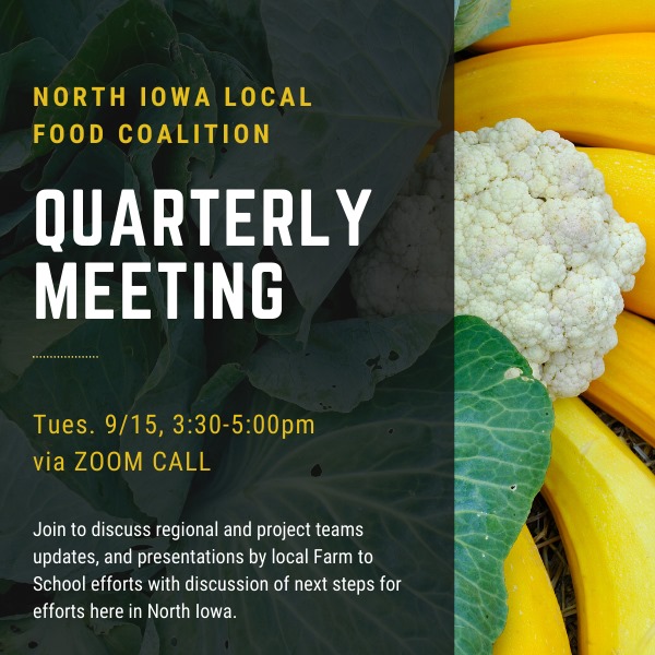 Join to discuss regional and project teams updates, and presentations by local Farm to School efforts with discussion of next steps for efforts here in North Iowa.