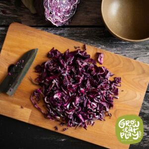 • Add the red cabbage and vinegar, stir until combined. Then add the remaining ingredients and stir.