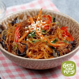 Served warm or cold, japchae is one of the most popular traditional dishes in Korea. It is stir-fried with glass noodles, fresh vegetables, and a sweet and savory sauce. This recipes comes to us from Kyong-Ae Smith of Mason City. She is a licensed fitness instructor and sushi chef. Ingredients with an asterisk (*) are available seasonally right here in North Iowa! Click on select ingredients to find them nearby or stop by your local farmer’s market.