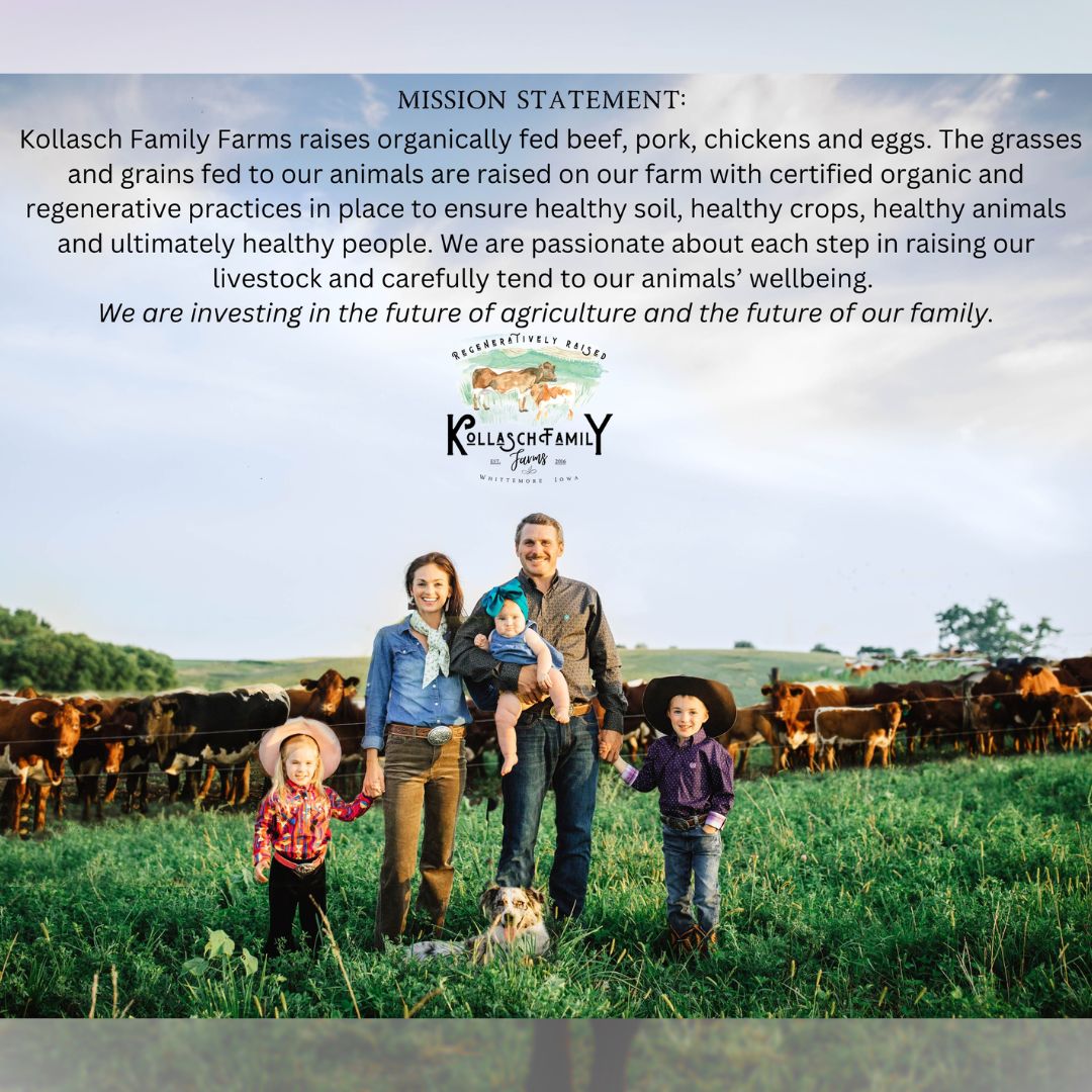 We raise regenerative beef, pork, chickens and eggs on our northern Iowa farm. We have four beautiful farm kids who manage their own portion of the farm – Kollasch Kids Coop, selling pastured eggs. Everything you see here from the marketing, customer service, crop and food production is done by us. We are a small family farm with BIG dreams to produce food that is beneficial for us, our soils and our future and can’t wait for you to join us!