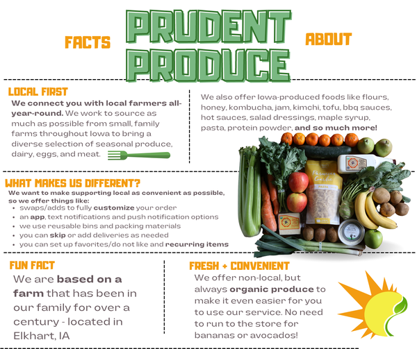 We are a food hub located in Elkhart, IA. We deliver to homes in Central Iowa and community locations in North Iowa. We carry local produce, meat, eggs, dairy, flour, kimchi, kombucha, cheese, and SO MUCH MORE. We also carry organic fruit and vegetables year round. We have identified a need in the community: connecting people with easy access to Good Food! By Good Food, we mean great-tasting, healthy, free of synthetic chemicals, and local-when-possible produce at affordable prices. Having great produce arriving at your doorstep encourages more consumption of Good Food, leading to healthier hearts, minds, and bodies.