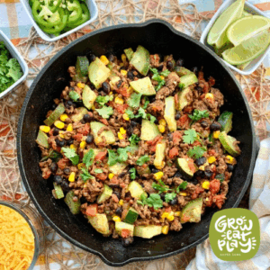 An easy, one-pan meal that’s perfect for weeknight dinners. Use yellow squash in place of the zucchini, add bell peppers, and whatever other summer produce you have on hand to make it your own. Skip the ground beef to make it vegan friendly! Ingredients with an asterisk (*) are available seasonally right here in North Iowa! Click on select ingredients to find them nearby or stop by your local farmer's market.