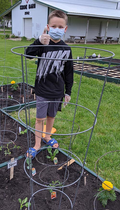 Left: First time 4-H vegetable gardener, Graham Holstad proudly displays his tomato cage he installed in his garden plot at the Worth County Fairgrounds.