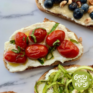 Ricotta toast is a quick snack or filling meal that can be whipped up in minutes using fresh ingredients. Enjoy this one hot by warming the tomato confit, or cold by using it straight from the fridge. Ingredients with an asterisk (*) are available seasonally right here in North Iowa! Click on select ingredients to find them nearby or stop by your local farmer's market.