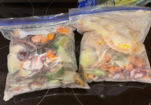 • Save vegetable scraps in a gallon ziplock bag or gallon container in the freezer. When the bag is full, add them to a large pot or slow cooker and add 4½ quarts of water, salt, and pepper. Bring to a boil, then simmer for 45 minutes.