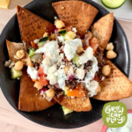 On a plate, layer pita chips, meat (optional), Greek chopped salad, tzatziki, and feta cheese (optional).