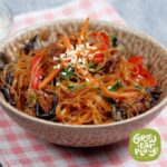 Served warm or cold, japchae is one of the most popular traditional dishes in Korea. It is stir-fried with glass noodles, fresh vegetables, and a sweet and savory sauce. This recipes comes to us from Kyong-Ae Smith of Mason City. She is a licensed fitness instructor and sushi chef. Ingredients with an asterisk (*) are available seasonally right here in North Iowa! Click on select ingredients to find them nearby or stop by your local farmer’s market.