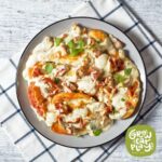 Add the garlic to the same skillet and cook for 30 seconds. Stir in heavy cream, broth, ¼ cup of the parmesan cheese, sun dried tomatoes, Italian seasoning, pepper, red pepper flakes, and additional salt, to taste.