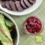 While vinegar mixture is heating prepare vegetables.Remove beet tops from root. Tear, or cut leaves off stems, and set leaves aside for another use. Chop beet stems into 1/4 inch pieces.If using carrots, slice into matchsticks. Slice cucumbers and radishes in half length-wise, and then into half moons.