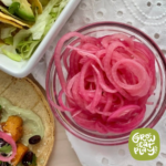 Place the thinly-sliced onions in a small bowl or pint-sized mason jar. Pour the hot vinegar mixture over the onions. Stir until combined. (Or if using a mason jar, place the lid on top and give the jar a quick shake.) Let the onions marinate for 30 minutes.