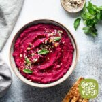 Roasted Beet Hummus: Preheat oven to 400 degrees. Remove beet tops from one beet and scrub. Wrap in foil and bake until soft (30 minutes or so). Add to blender/processor.