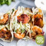 Assemble tacos with tortilla shells of choice using 1/4 of the slaw mixture and 1/4 of the shrimp mixture per serving.