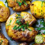 Put the boiled potatoes onto the prepared baking sheet. Using a potato masher or fork, carefully smash the potatoes until flattened but still in one piece. Top with olive oil, garlic and herbs of choice. Place into oven and bake for 18-20 minutes, or until golden brown and crispy.