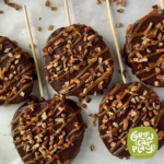 Line a medium baking sheet with parchment paper. Slice apples into 1/2″ thick round slices. Make a small incision in the bottom of the apple slices and stick in popsicle sticks. You can remove core or apple seeds if desired. Remove excess moisture from apples by patting with paper towel.