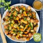 When vegetables are browned and tender, remove them from the oven. On a large plate, or in a salad bowl arrange cooked vegetables and croutons, stirring gently to mix all together. Drizzle dressing over the top and enjoy immediately.